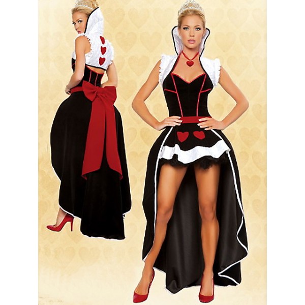Eleganten in bogat kostum srčne kraljice sestavljajo oprijeta oblekica, bolero z visokim ovratnikom, dolgo krilo z veliko rdečo pentljo in kronica za v lase. Oblekica ima nabrano krilo z všitim podkrilom. Robovi bolera so okrašeni z drobnimi volančki. Velikost: S/M Dostava: 1-3 delovne dni